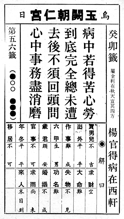 籤詩網 六十甲子籤 第56籤 病中若得苦心勞 到底完全總未遭 去後不須回頭問 心中事務盡消磨